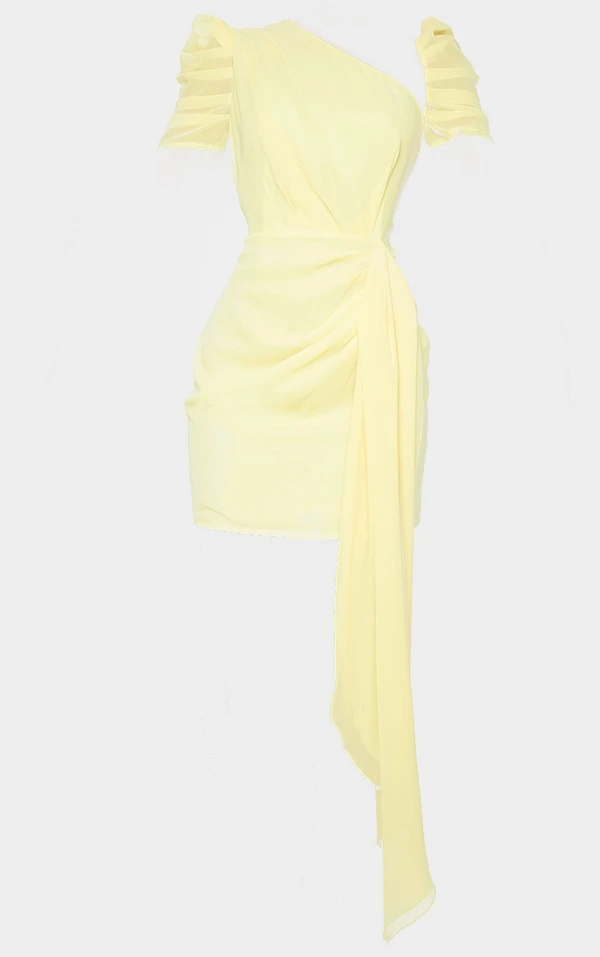 Robe moulante asymétrique en mousseline de soie jaune citron détail drapé