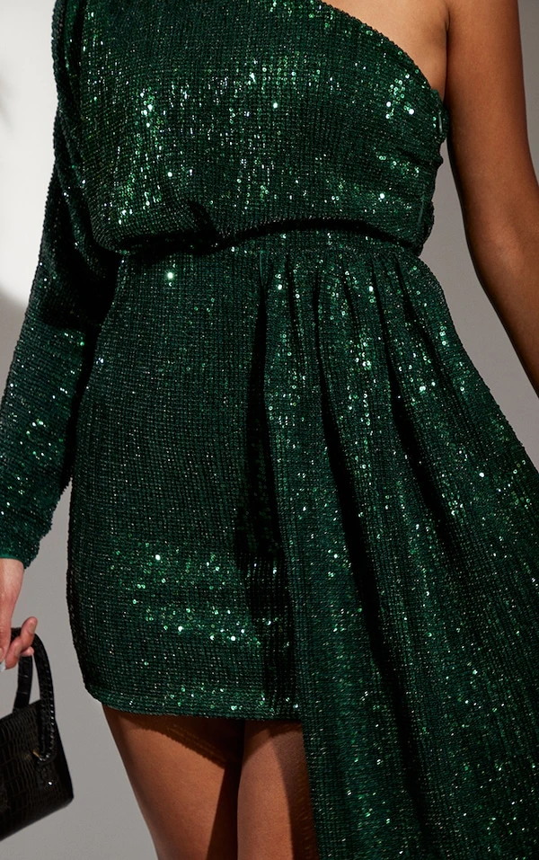 Robe moulante asymétrique en sequins vert émeraude effet drapé
