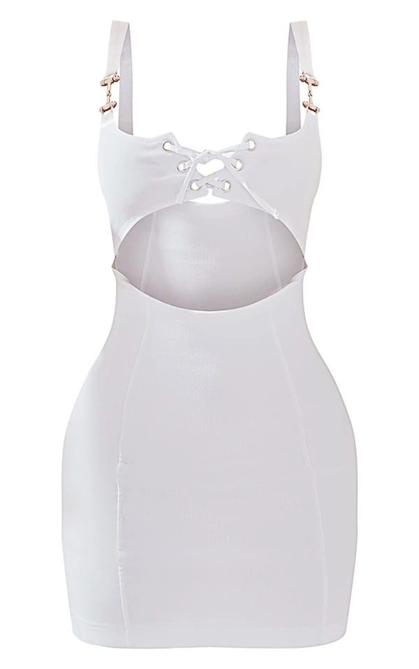 Robe moulante blanche en maille stretch tissée à lacets et liserés