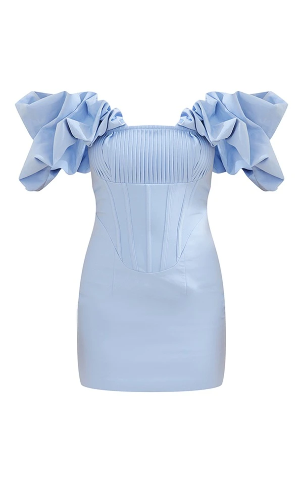 Robe moulante bleu clair à manches bouffantes et corset plissé
