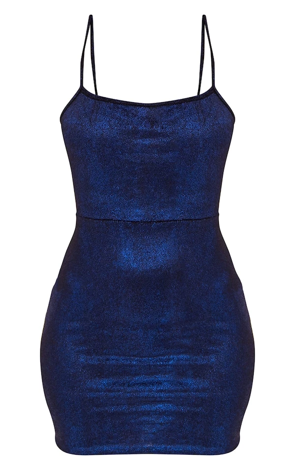 Robe moulante bleu métallique à paillettes nouée dans le dos