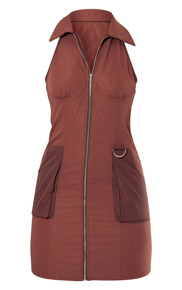 Robe moulante cargo style utilitaire chocolat à zip et détail bonnets