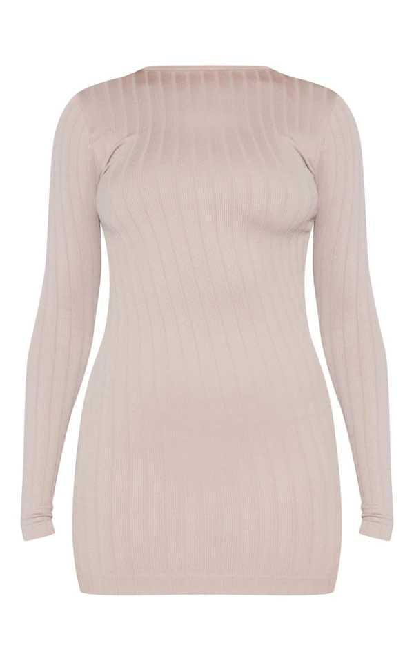 Robe moulante côtelée gris pierre à manches longues et contours structurés