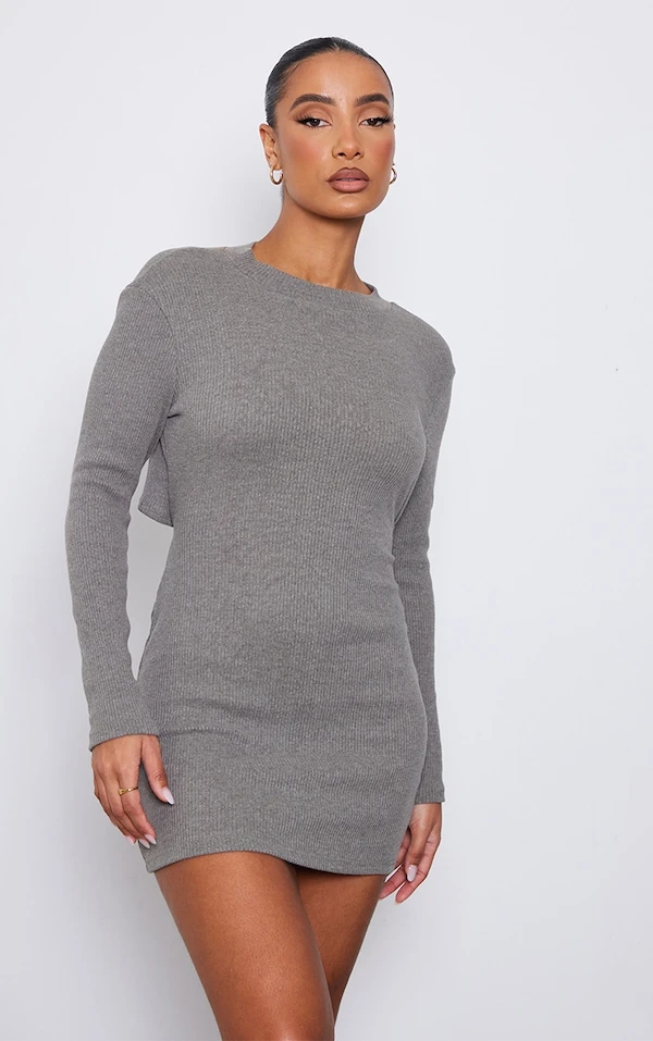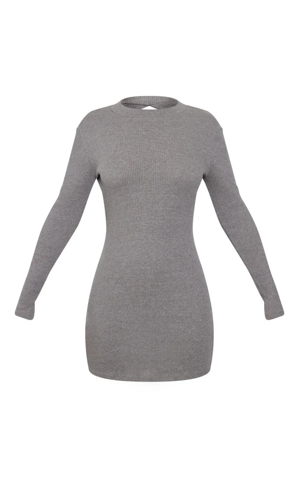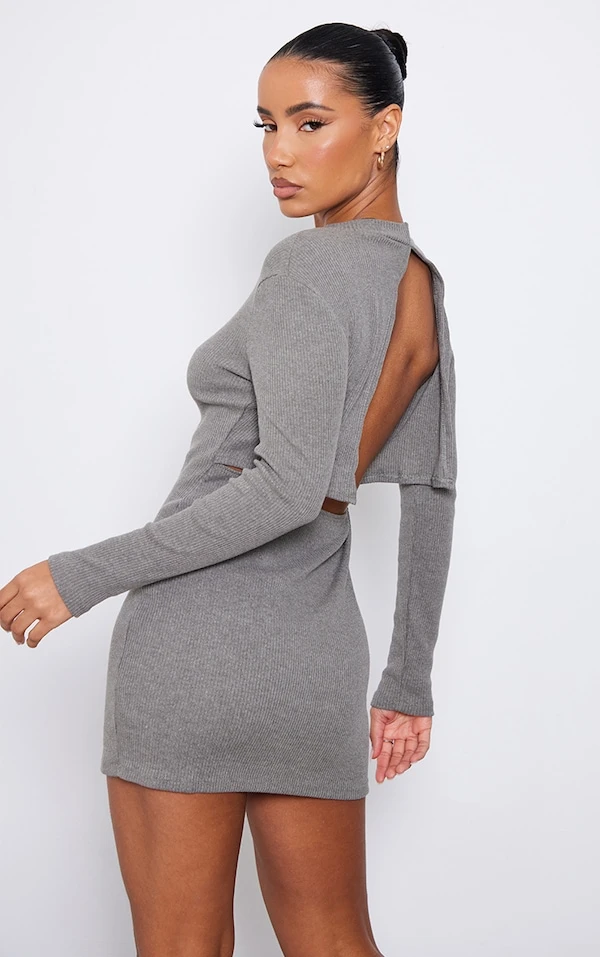 Robe moulante côtelée grise à dos ouvert et col montant