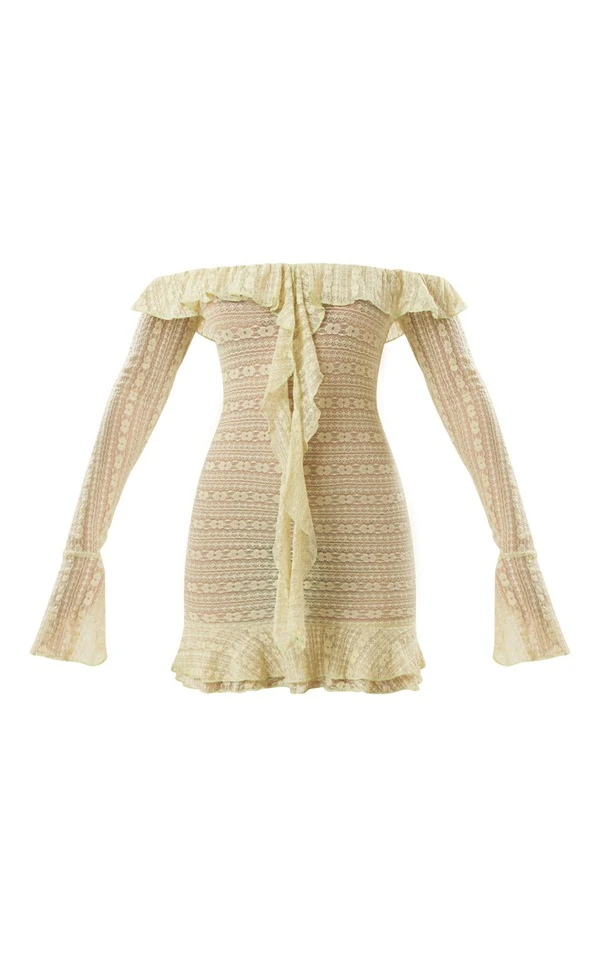 Robe moulante drapée en dentelle kaki transparente à col bardot et volants