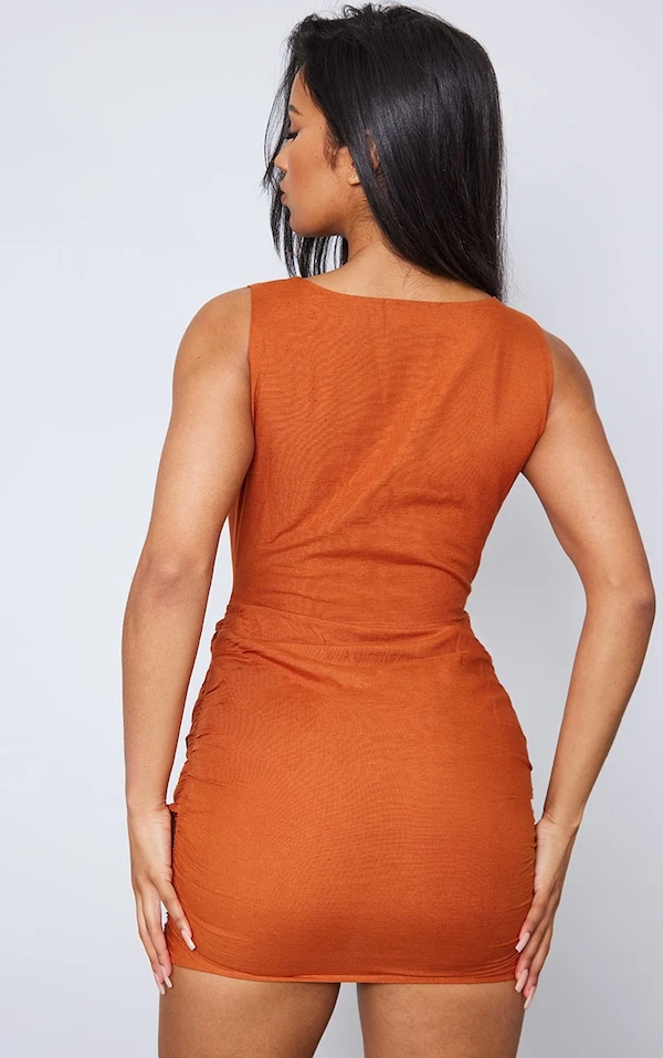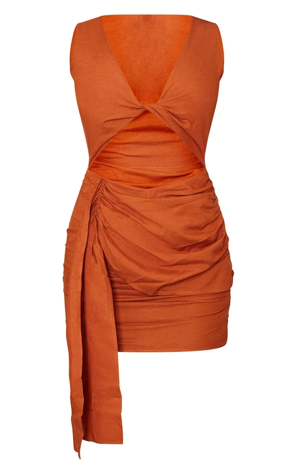 Robe moulante effet lin rouille à torsade et détail drapé