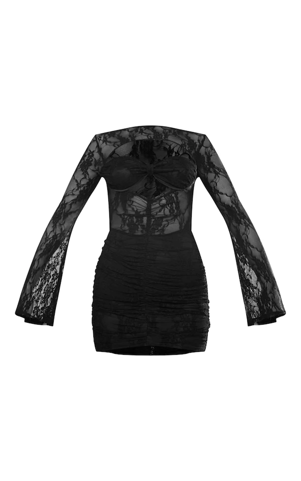 Robe moulante en dentelle transparente noire à fronces et armatures