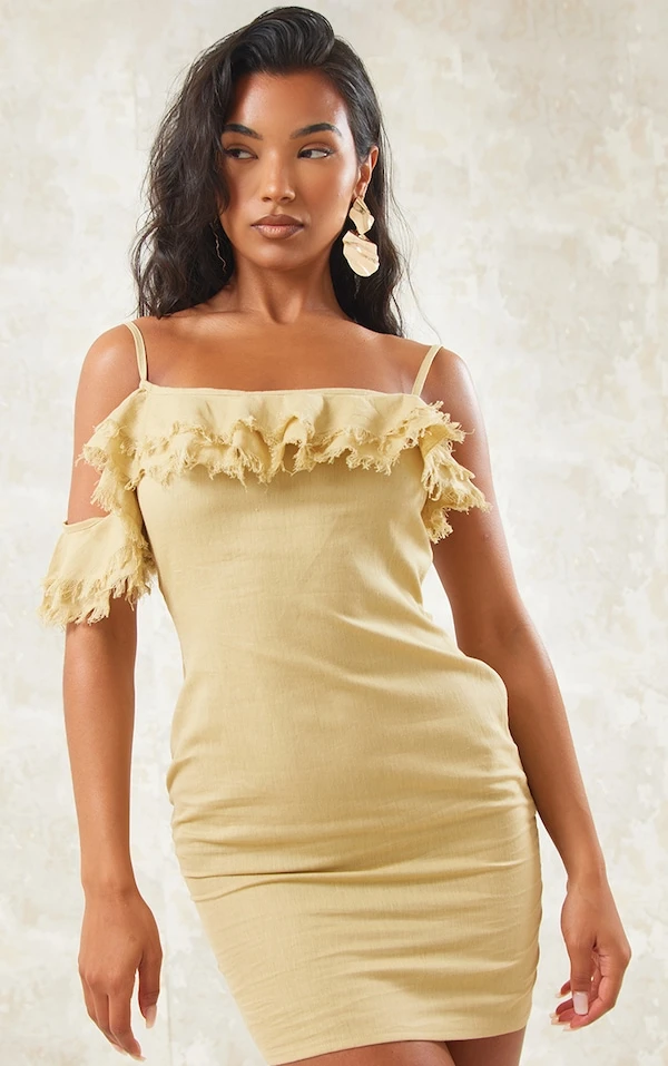 Robe moulante en effet lin vert sauge à bretelles et volants à ourlet élimé