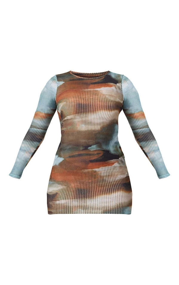 Robe moulante en jersey texturé multicolore imprimé abstrait à manches longues