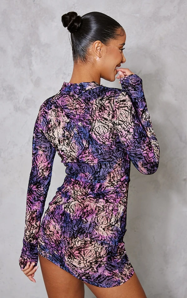 Robe moulante en mesh floqué multicolore à détail froncé et manches longues