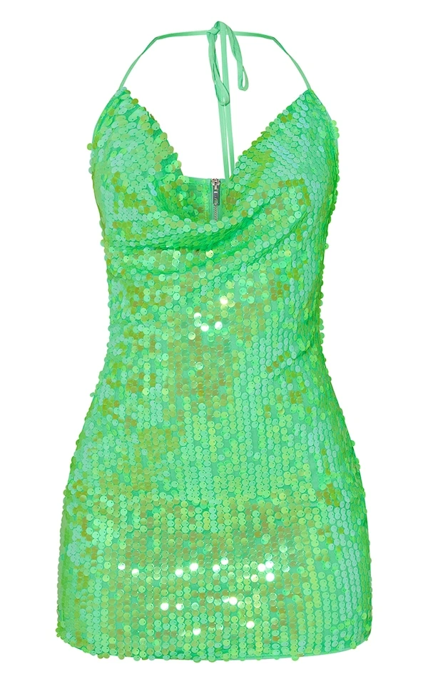 Robe moulante en sequins verts à dos nu et col bénitier