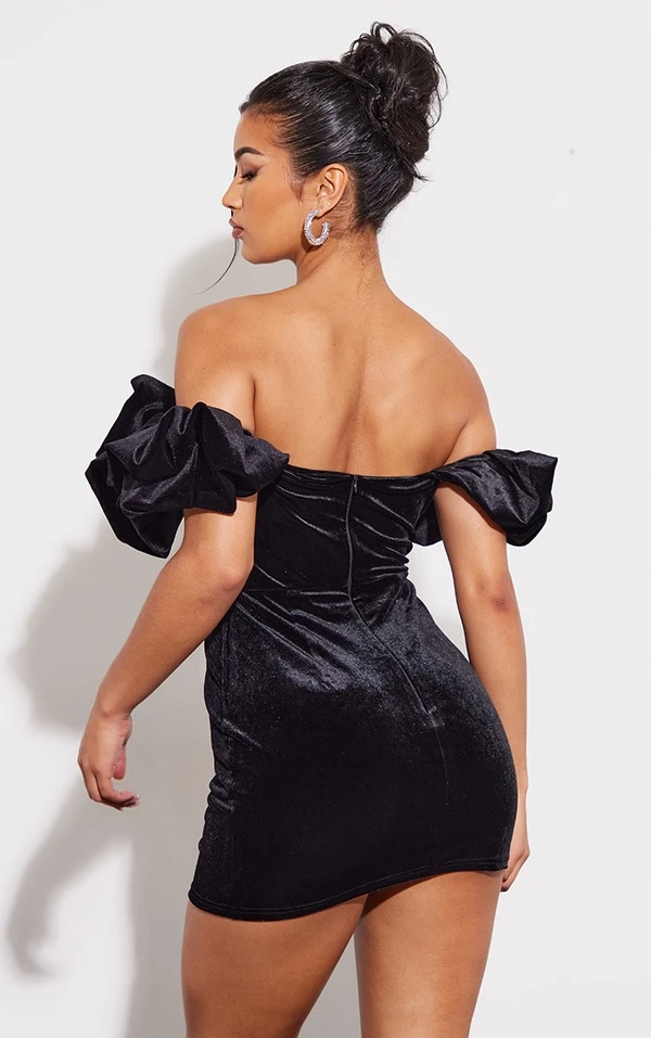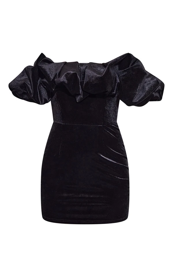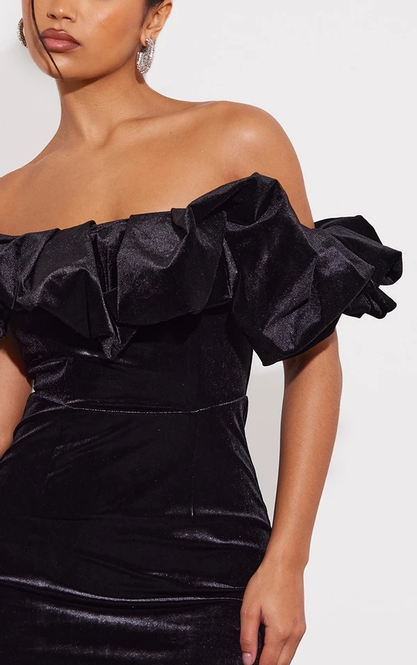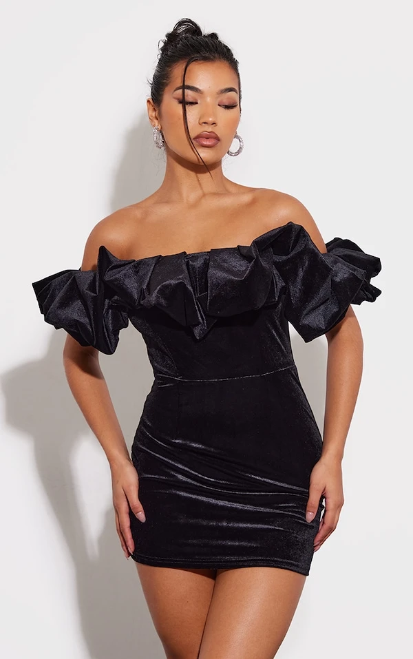 Cette robe ne va laisser personne indifférent ! Avec sa matière en velours noir, son col bardot, son design à volants et sa coupe moulante à souhait, elle est juste craquante. On l’adore portée avec des créoles dorées et des compensées !