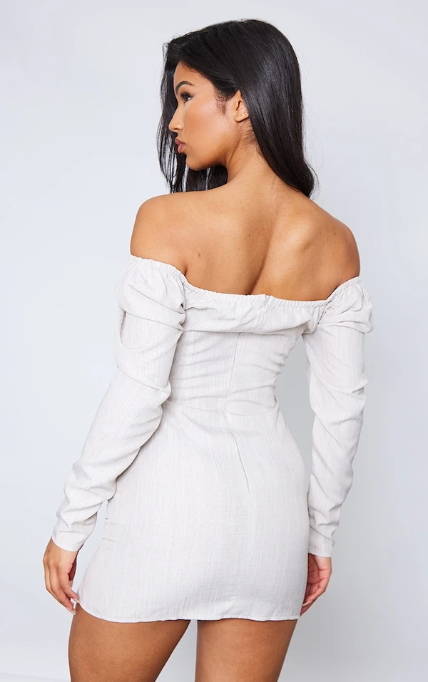 Robe moulante gris pierre effet lin plissée à liserés et col bardot