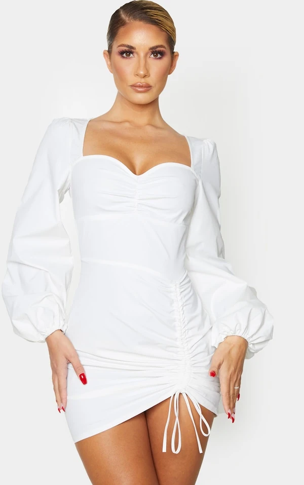 Robe moulante manches longues blanche à col coeur froncé