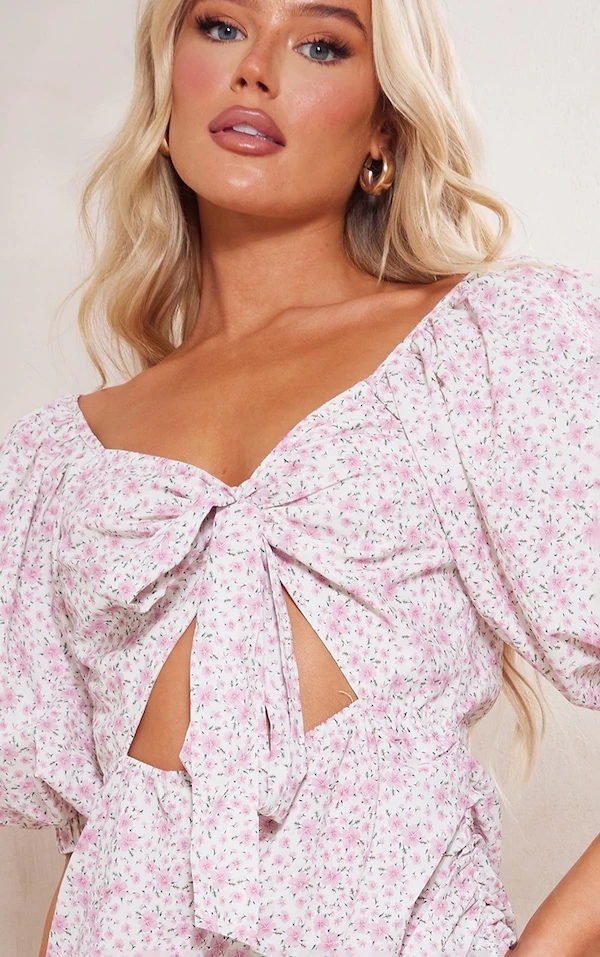 Robe moulante rose fleurie nouée devant à manches bouffantes