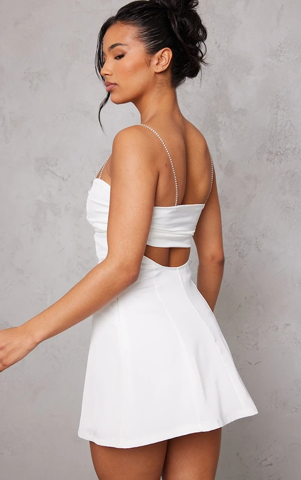 Robe moulante satinée blanche à boutons et bretelles strassées