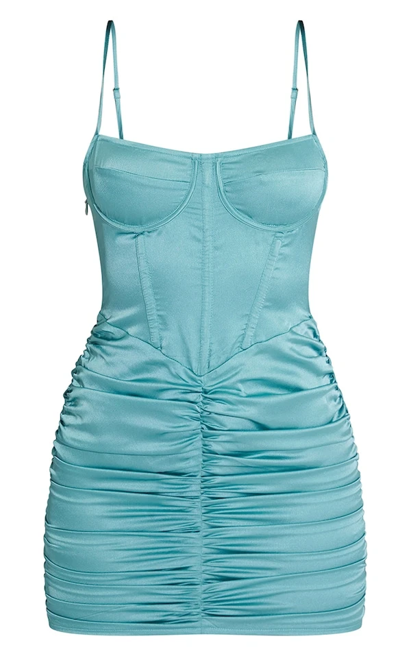 Robe moulante satinée bleu sarcelle à détail corset et jupe froncée