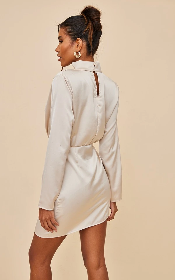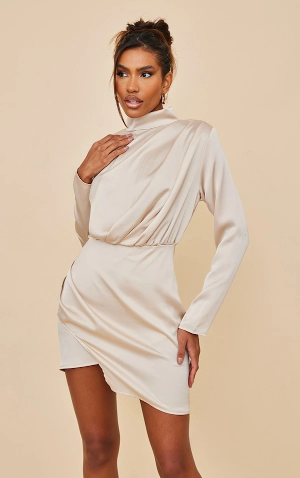 Robe moulante satinée champagne à épaulettes et manches longues