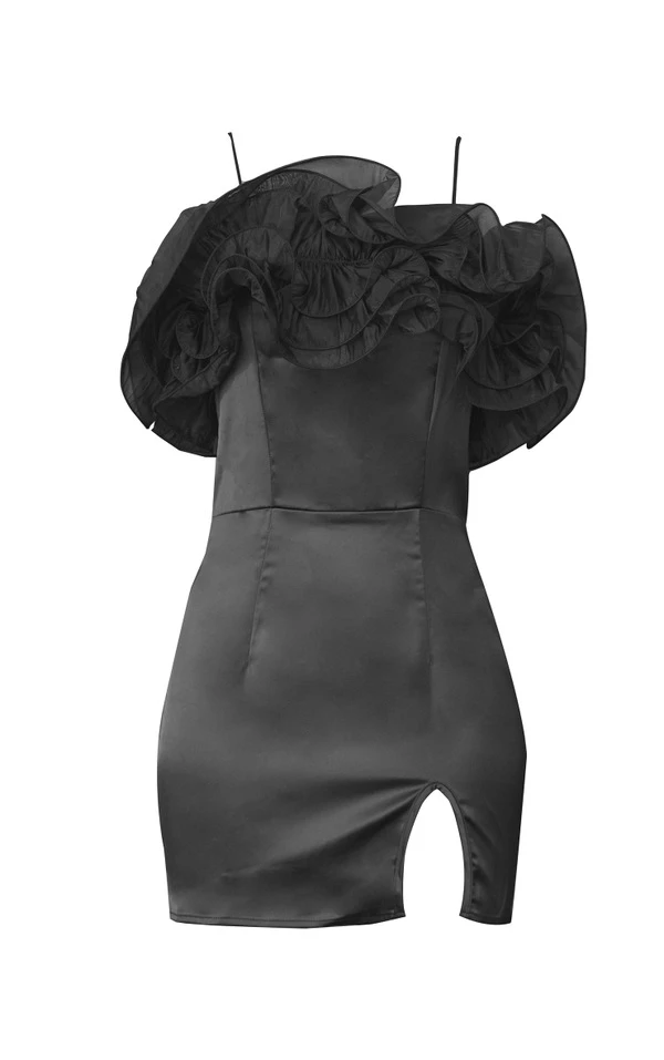 On craque pour cette robe moulante ! Avec son effet satiné, sa couleur noire et ses bretelles volantées, elle est à tomber. Il suffit d’enfiler une paire de talons et quelques accesoires pour un look de soirée ultra glam. Vous êtes lookée comme jamais !