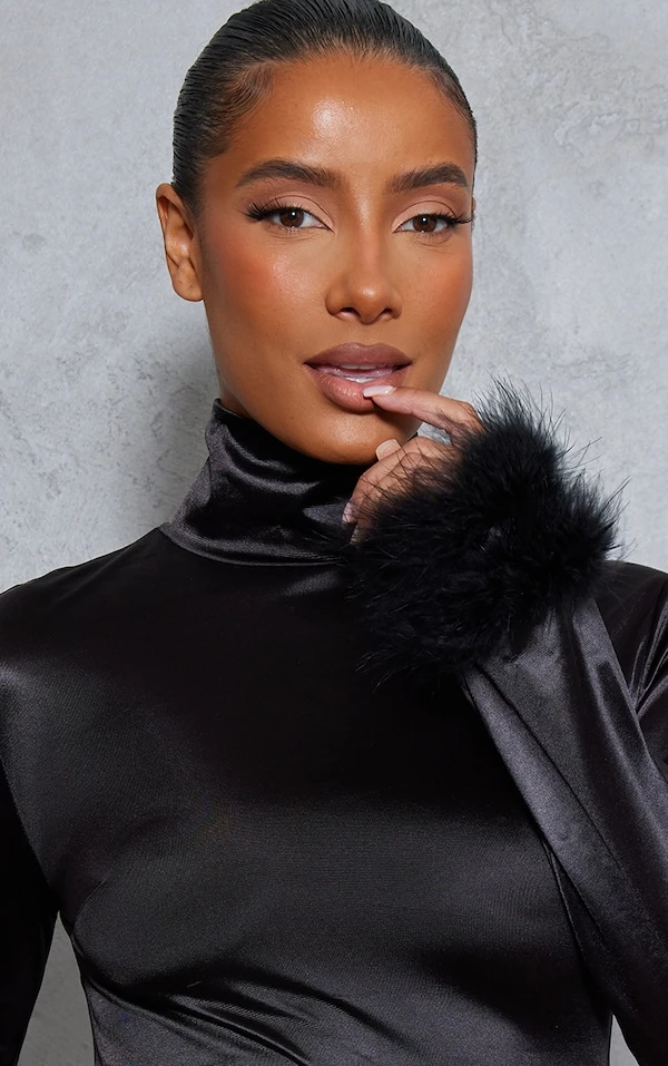 Tellement chic dans cette robe à la coupe moulante. Avec sa matière satinée, sa couleur noire qui se porte avec tout et son design à col montant et à bordures en plumes, on l’adore. C’est à porter avec une paire de mules et quelques accessoires. En soirée, c’est vous la plus belle !