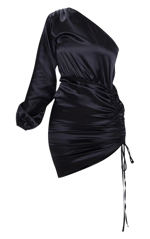 Luxe le satiné noir! Sur cette robe à la coupe moulante, à l’effet froncé et à la manche unique, c’est impossible de résister. Snatched ou rien, c’est le mot d’ordre.