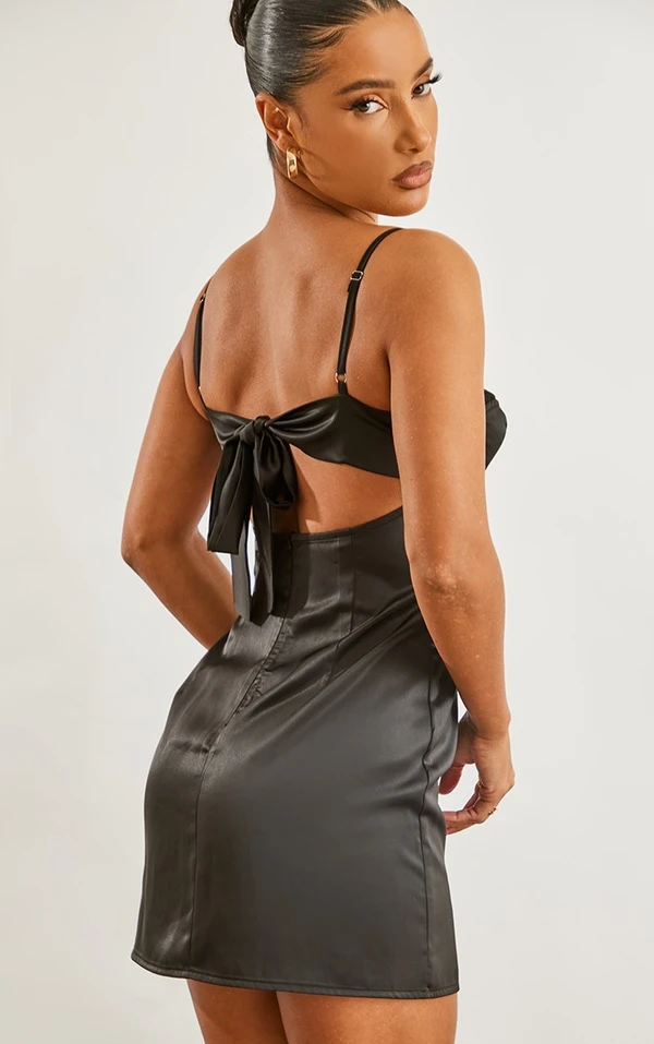 Robe moulante satinée noire nouée derrière à bonnets en dentelle