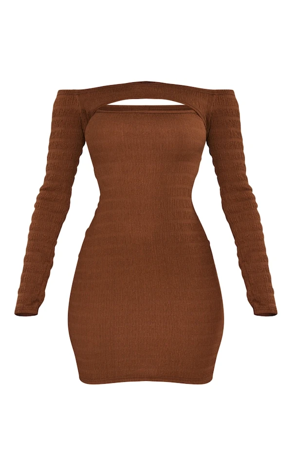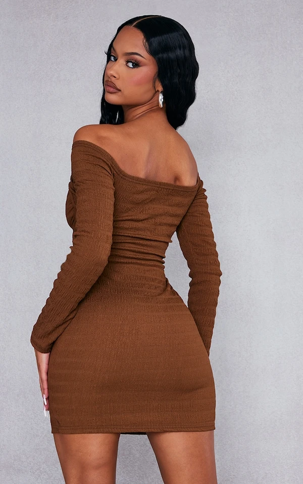 Délicieusement stylée dans cette robe à la coupe moulante ! Son effet texturé est très canon et on adore son coloris chocolat et son col bardot découpé. Pour un look de soirée très stylé, c’est à porter avec une paire de talons hauts et des créoles larges.
