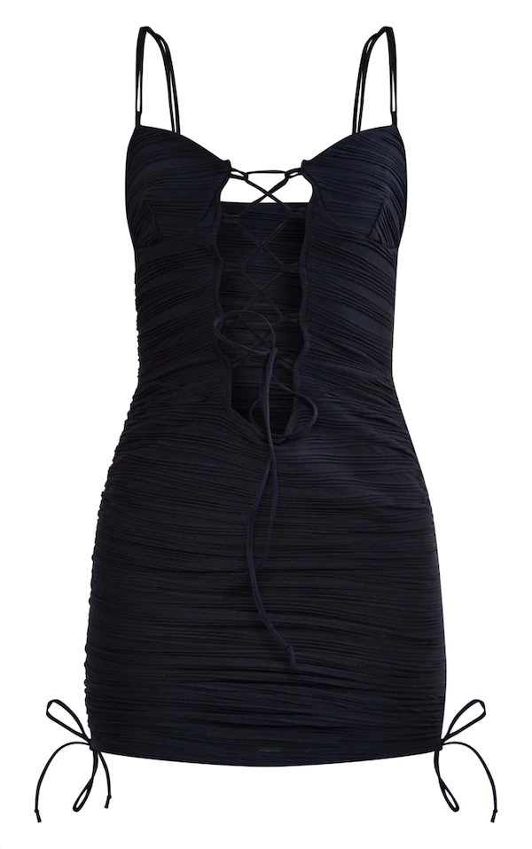 Robe moulante texturée noire à lacets et bretelles