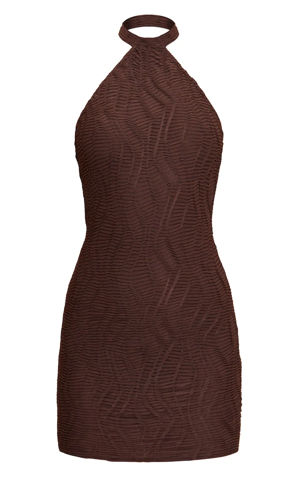 Robe moulante texturée transparente chocolat nouée dans le cou à dos ouvert