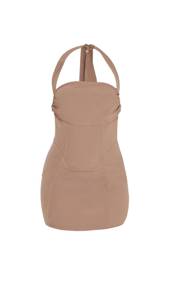 Robe moulante tissée café au lait à dos nu noué et armatures