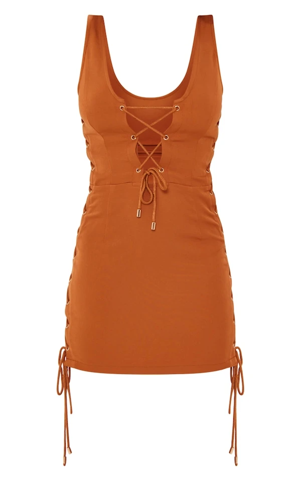 Robe moulante tissée rouille à lacets et bretelles