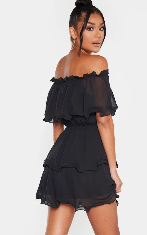 Robe noire fluide à col bardot et volants