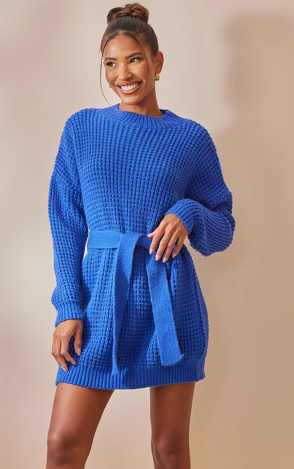 Trop canon cette robe ! Avec sa maille tricot so cosy, son coloris bleu vif et son style gaufré, c’est clairement must-have. On enfile une paire de cuissardes et des créoles épaisses. Crush sur vous dans ce look.