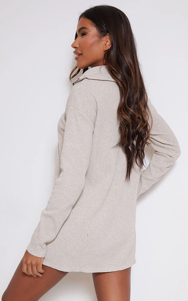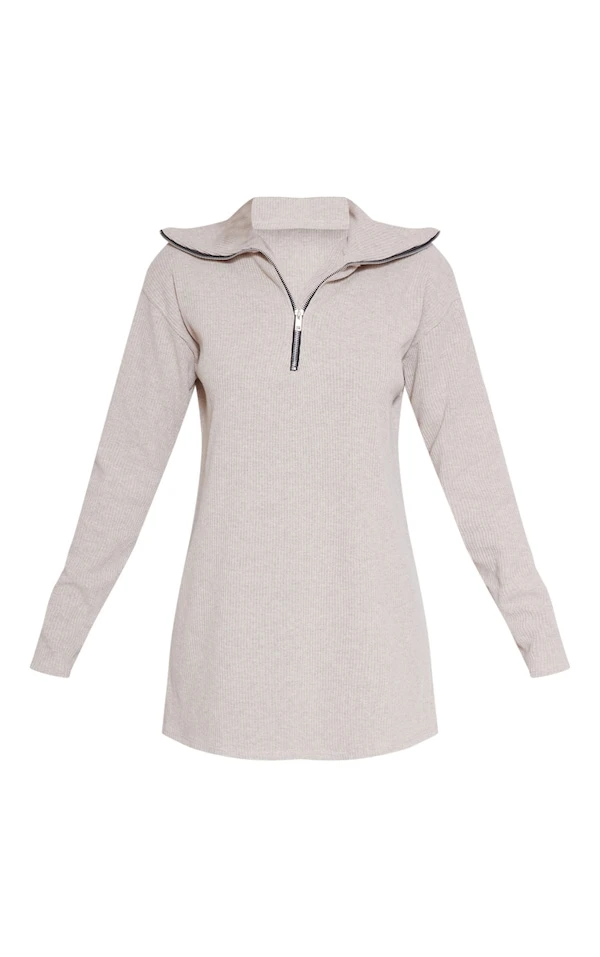 Robe pull oversize côtelée sable à col haut et demi-zip