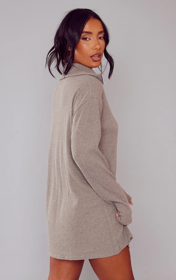 Robe pull oversize côtelée vert sauge kaki à col haut et demi-zip
