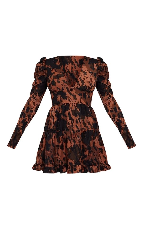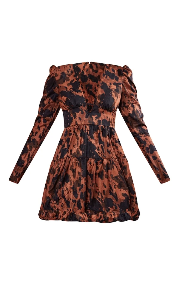 Robe rétro chocolat imprimé abstrait à manches bouffantes et ourlet volanté