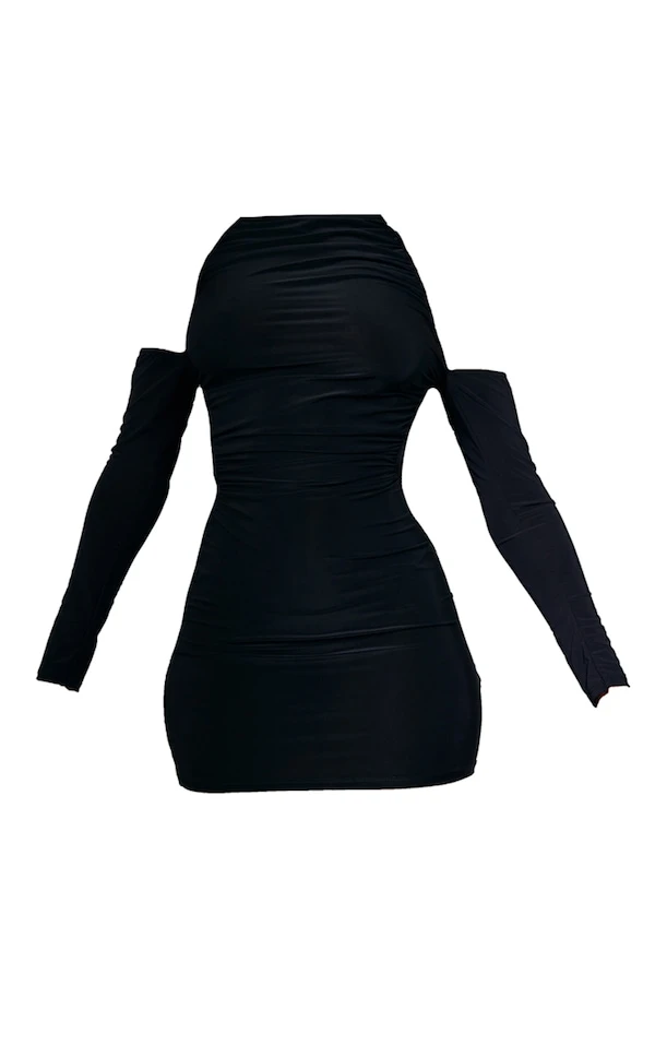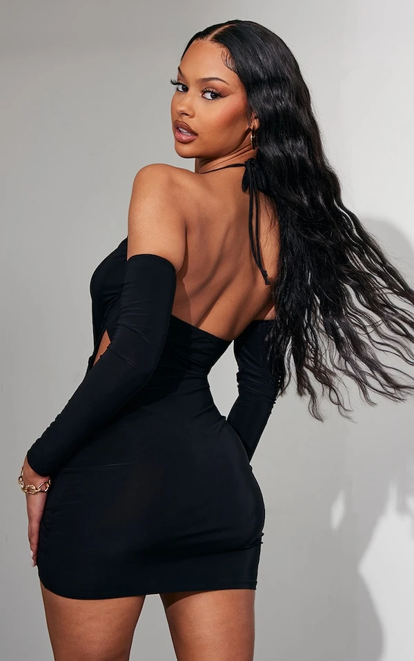 Robe très moulante découpée noire à dos nu à épaules dénudées
