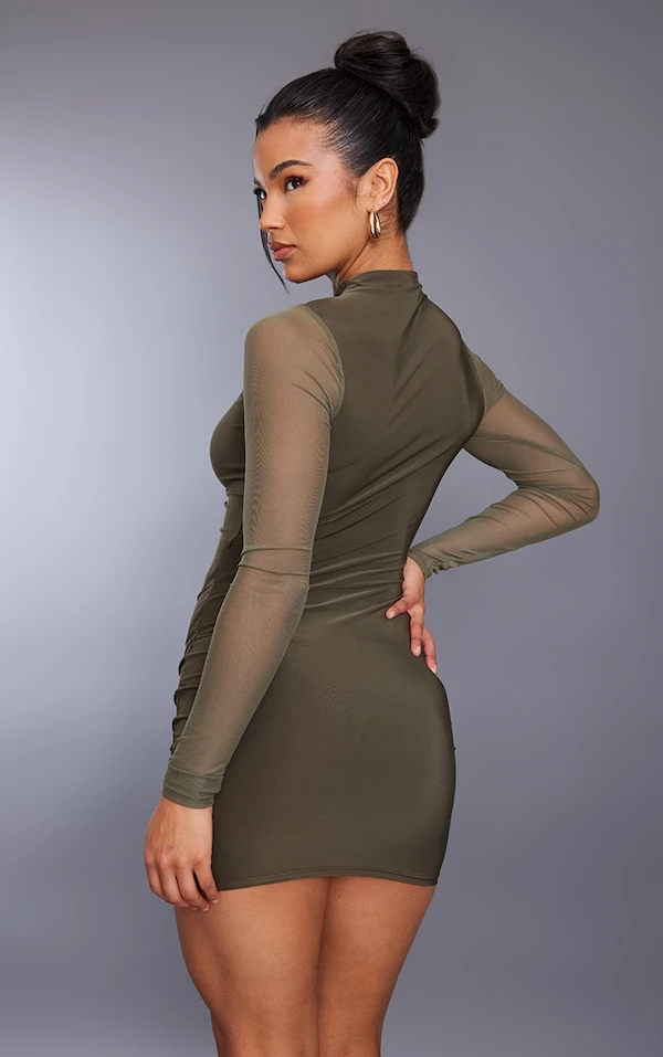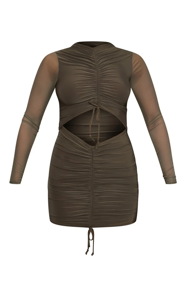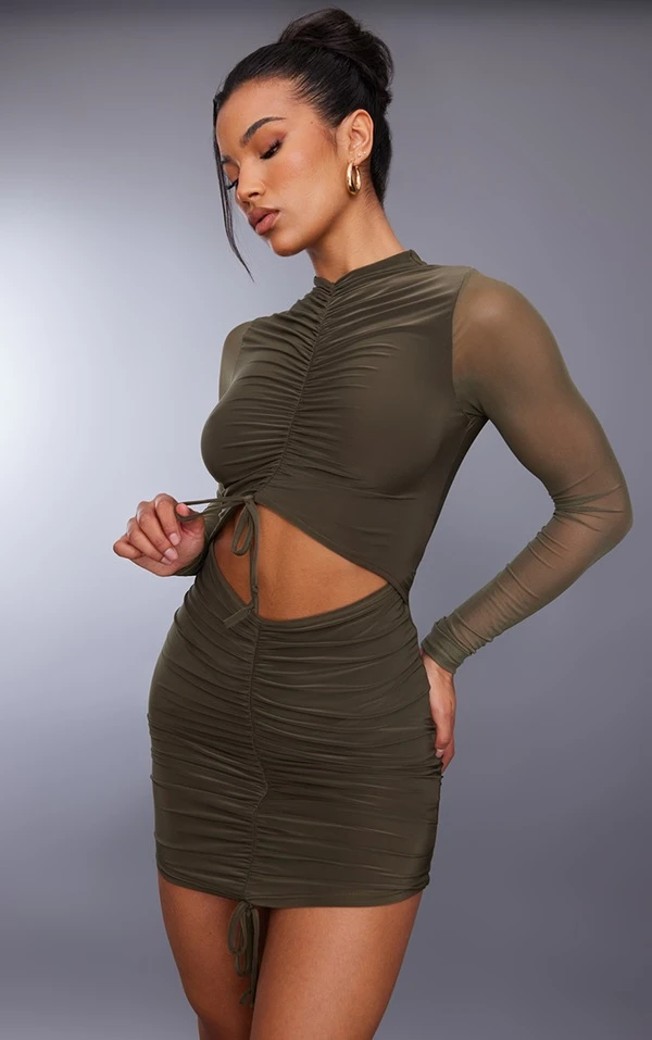 Robe très moulante froncée kaki mousse découpée à manches en mesh