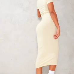 Robe-corset Moulante En Bandage Crème à Bretelles Croisées Et Côtés Découpés