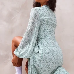 Shape Robe Portefeuille Mi-longue Satinée Verte Imprimé Petites Fleurs