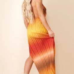 Robe Asymétrique Longue Plissée Marron Imprimé Dégradé à Dos échancré