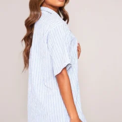 Robe Chemise Texturée Rayée Bleue à Manches Courtes Et Poche