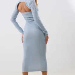 Robe Bustier Mi-longue Côtelée Texturée Bleu Acier à Détail Manches