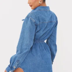 Robe Chemise Cintrée En Jean Moyennement Délavé à Manches Longues
