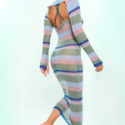 Robe Longue En Maille Tricot Ajourée à Rayures Bleues Et Manches