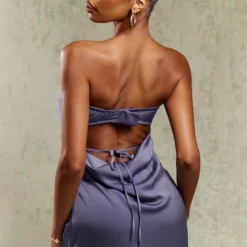 Robe Moulante Bustier Satinée Bleu Minéral à Bretelle Dans Le Dos