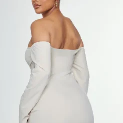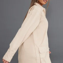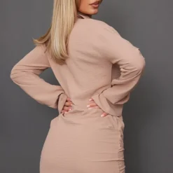 Robe Chemise Tissée Taupe Texturée Très Décolletée à Manchettes évasées