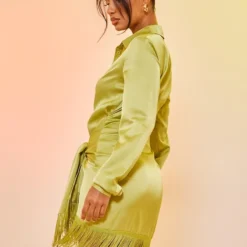 Robe Chemise Satinée Vert Citron à Détail Drapé Et Ourlet Frangé