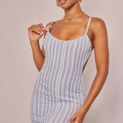 Robe T-shirt Droite En Effet Lin Bleu Découpé à Rayures Et Liens Noués Au Dos