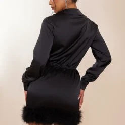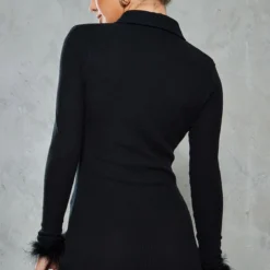 Robe Chemise Noire Froncée Côtelée Et Brossée à Manchettes à Plumes